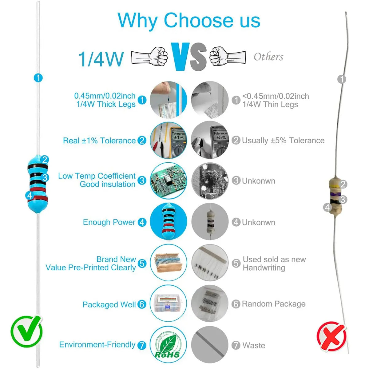 Upgraded 1/4w ±1% Metal film resistor with RoHS certification ; 2 Pins' Length: 0.96 inch / 24.5 mm. Able to cut resistor's pins freely for breadboard in electronic projects
