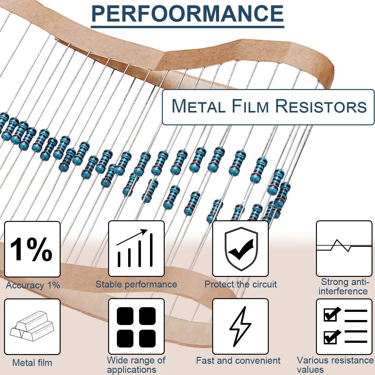 1/4watt Metal film resistor kit with ±1% tolerance for DIY project and experiments.1/4w film and thicker metal pins to have a better connection and stable performance features which help you finish the electrical experiments project faster and more smoothly.