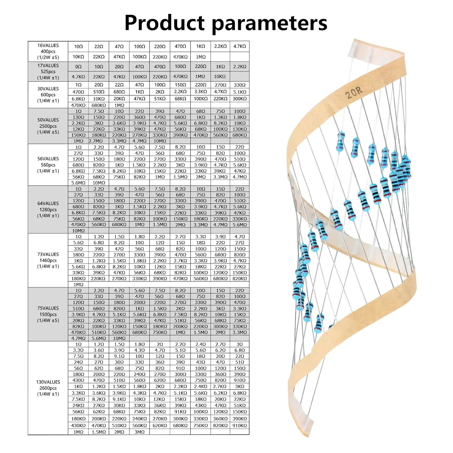 30Different Values 300/600pcs Resistors (each one 10pcs): 0Ω 1Ω 2.2Ω 4.7Ω 7.5Ω 10Ω 15Ω 22Ω 33Ω 39Ω 47Ω 51Ω 56Ω 68Ω 100Ω ===== 120Ω 150Ω 200Ω 220Ω 300Ω 330Ω 390Ω 470Ω 510Ω 680Ω 1KΩ 1.5KΩ 2KΩ 2.2KΩ 3KΩ ===== 3.3KΩ 4.7KΩ 5.1KΩ 5.6KΩ 6.8KΩ 7.5KΩ 8.2KΩ 10KΩ 15KΩ 22KΩ 33KΩ 47KΩ 51KΩ 56KΩ 68KΩ ===== 75KΩ 100KΩ 150KΩ 220KΩ 300KΩ 330KΩ 470KΩ 510KΩ 680KΩ 1MΩ 2MΩ 2.2MΩ 4.7MΩ 5.1MΩ 10MΩ
